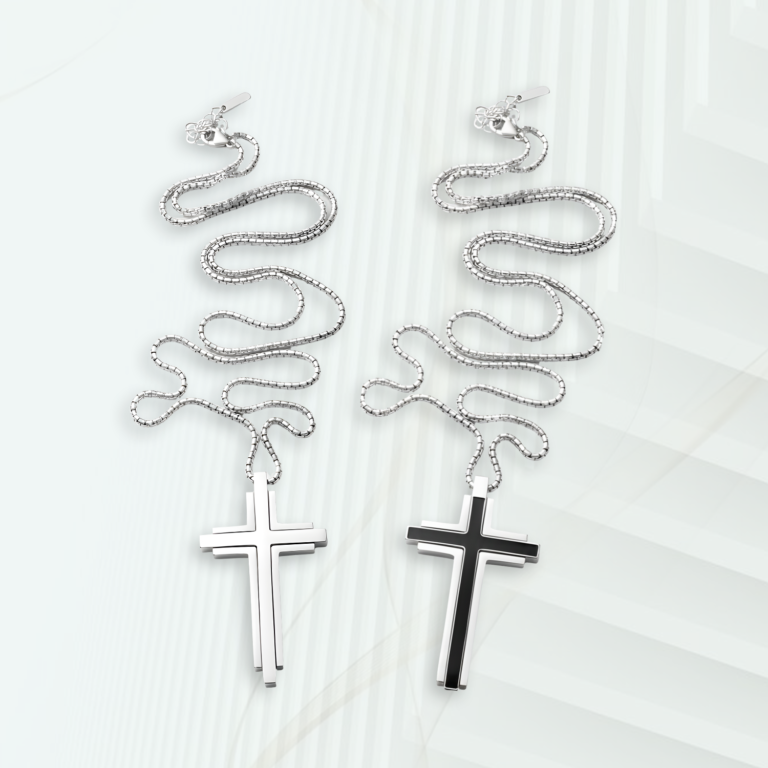Stylish stainless steel cross necklace in a black and silver finish, designed for everyday comfort and lasting shine. Hypoallergenic and durable, this Christian pendant is perfect for daily wear or meaningful gifting for men and women.