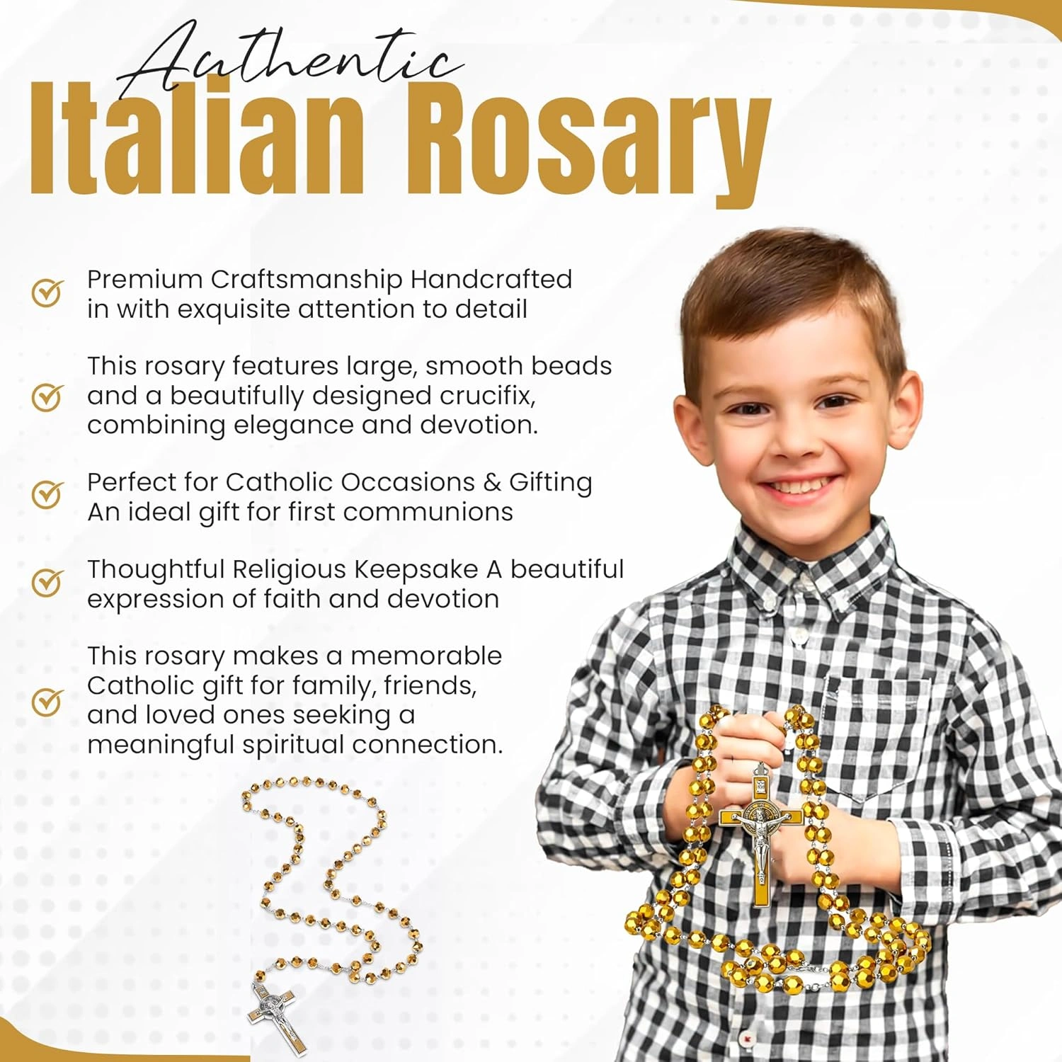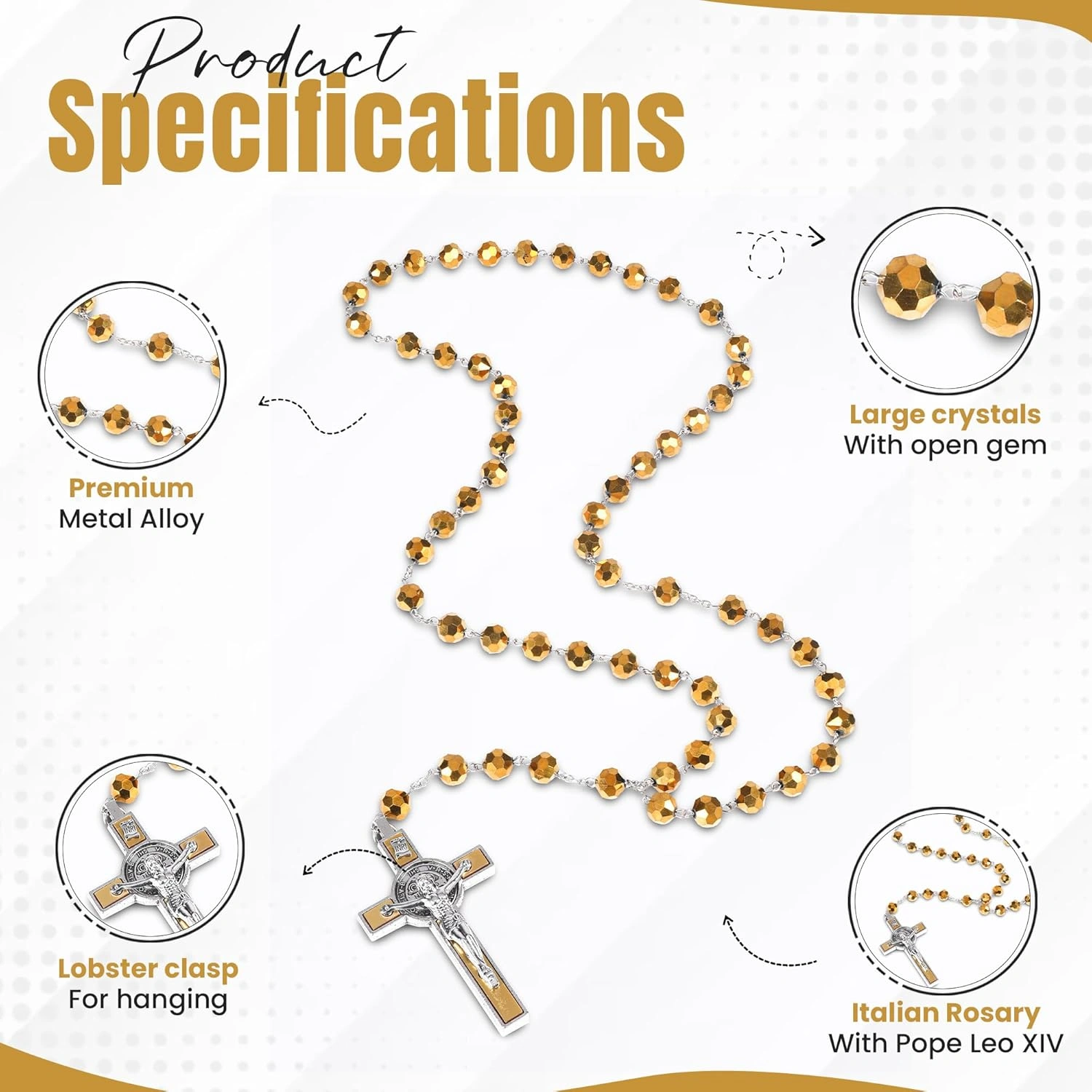 Elegant Catholic rosary necklace featuring radiant gold crystal beads and a detailed crucifix, designed for daily prayer, meditation, and meaningful religious gifting. Suitable for men and women, this Italian-inspired rosary can be worn, displayed in your car, or placed on a home altar as a beautiful symbol of faith and devotion.